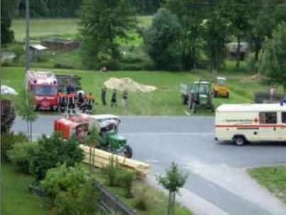 den Graben gekippt. Die Aufgabe der Feuerwehr bestand darin auslaufendes Oel und Treibstoff zu binden. Daher wurde eine Oelsperre im vorbeifließendem Gewaesser errichtet, welche
