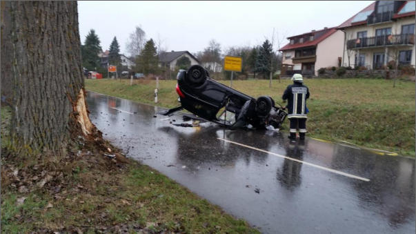 Beim Eintreffen der Feuerwehr Schornweisach lag das Unfallfahrzeug auf dem Dach, die beiden Insassen konnten sich unter der Mithilfe der anwesenden Ersthelfer aus dem Fahrzeug