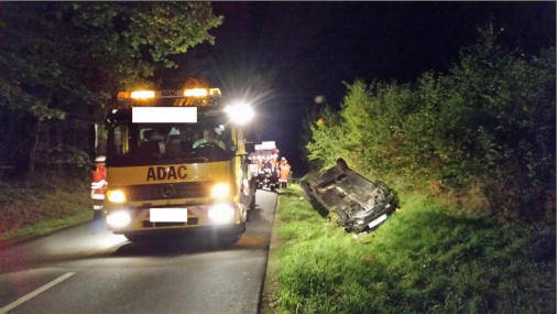 Unfallfahrzeug auf dem Dach, die Fahrzueuginsassin wurde von Ersthelfern